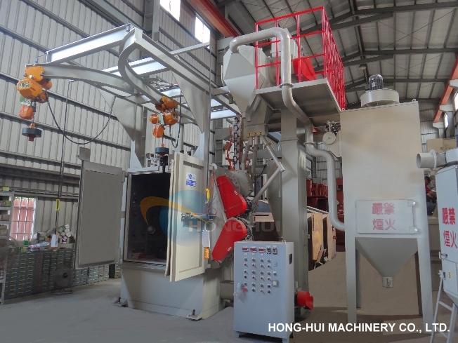 | This machine uses steel rail hoist and rotating hanger to rotate the work piece. Use the sand blast wheel located at different locations to shot steel ball at high speed continuously. The rotating hanging work pieces rotate at low speed and are sprayed evenly by the steel balls. In a short time the work pieces will be restored to their clean and pretty surface for the next step treatment. The two rails set up for this machine are used in turn. While one rail with hanging work pieces for sand blast operation, the other rail is used to install the work pieces on the hangers. The rotating application will result in maximum efficiency. This machine is applicable for middle and large castings, aluminum-zinc press casting products and other many easy to hang work pieces etc. |